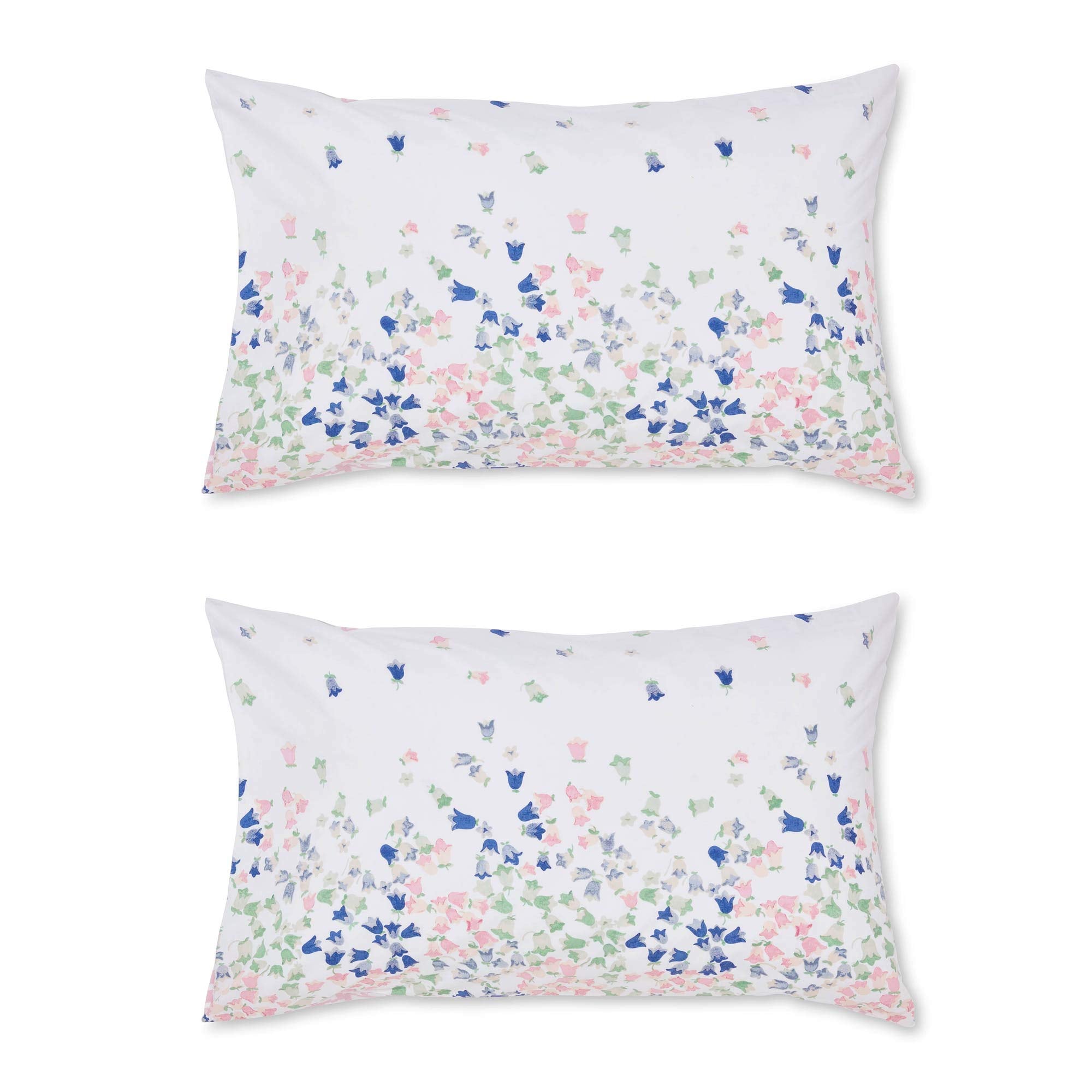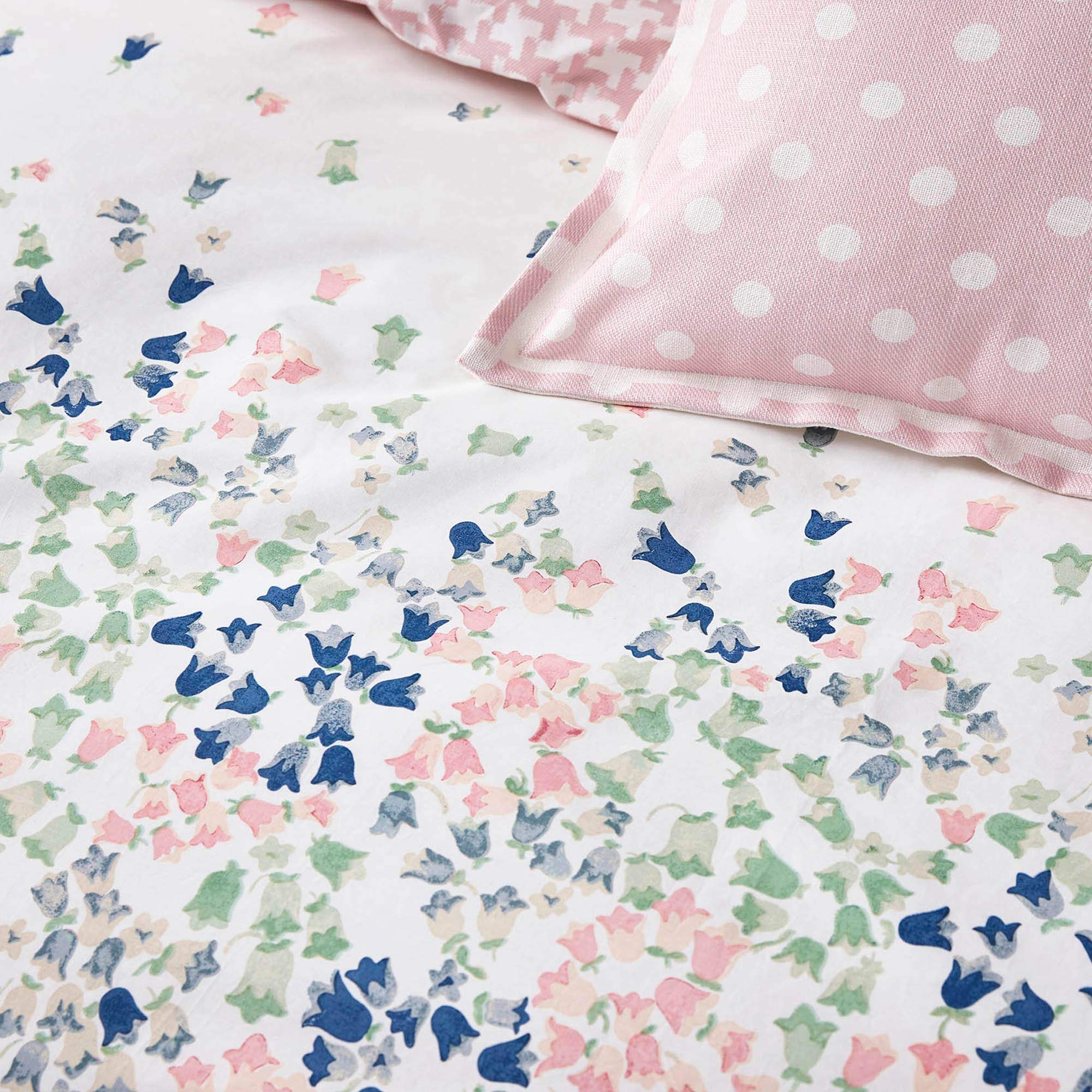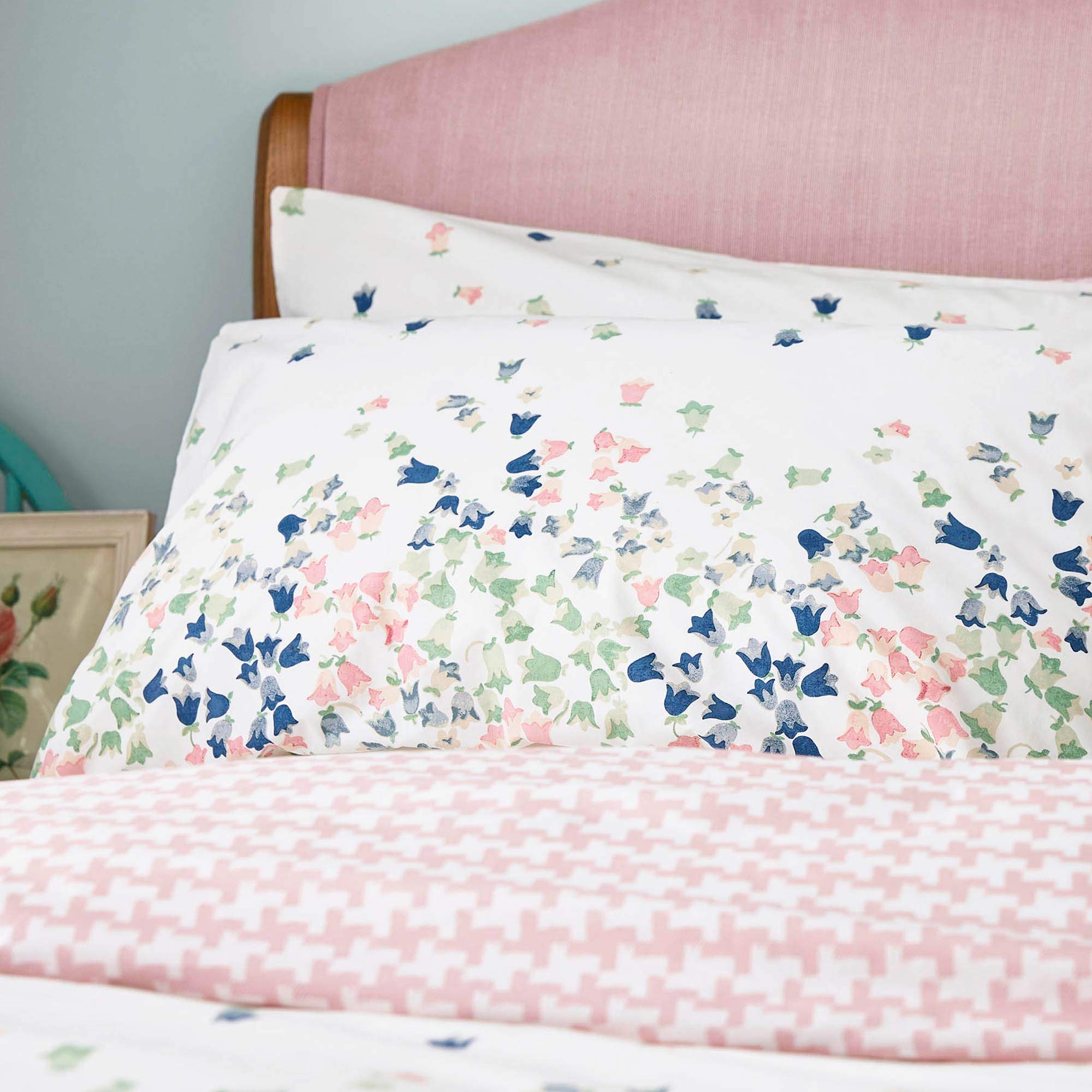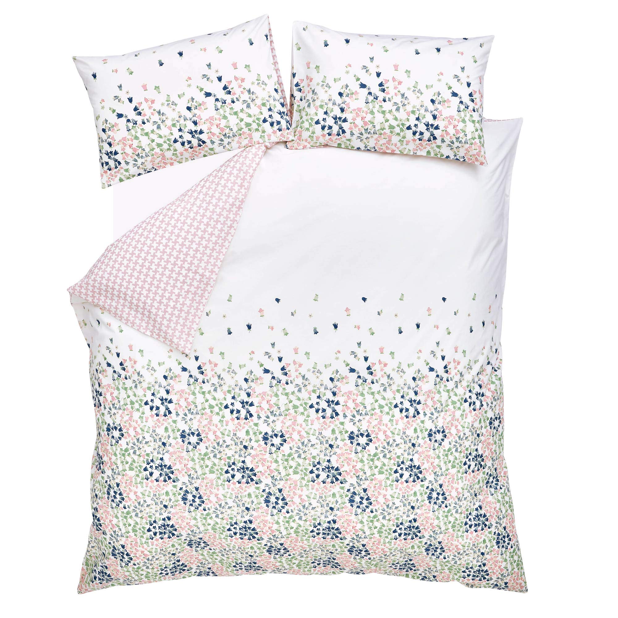 A delicate and subtle print, scattered Bluebells in soft tones of mint, blush and navy create a calm atmosphere in your bedroom. Teamed with a soft pink dog tooth reverse this beautifully soft bedlinen set is presented on 200 thread count 100% cotton.