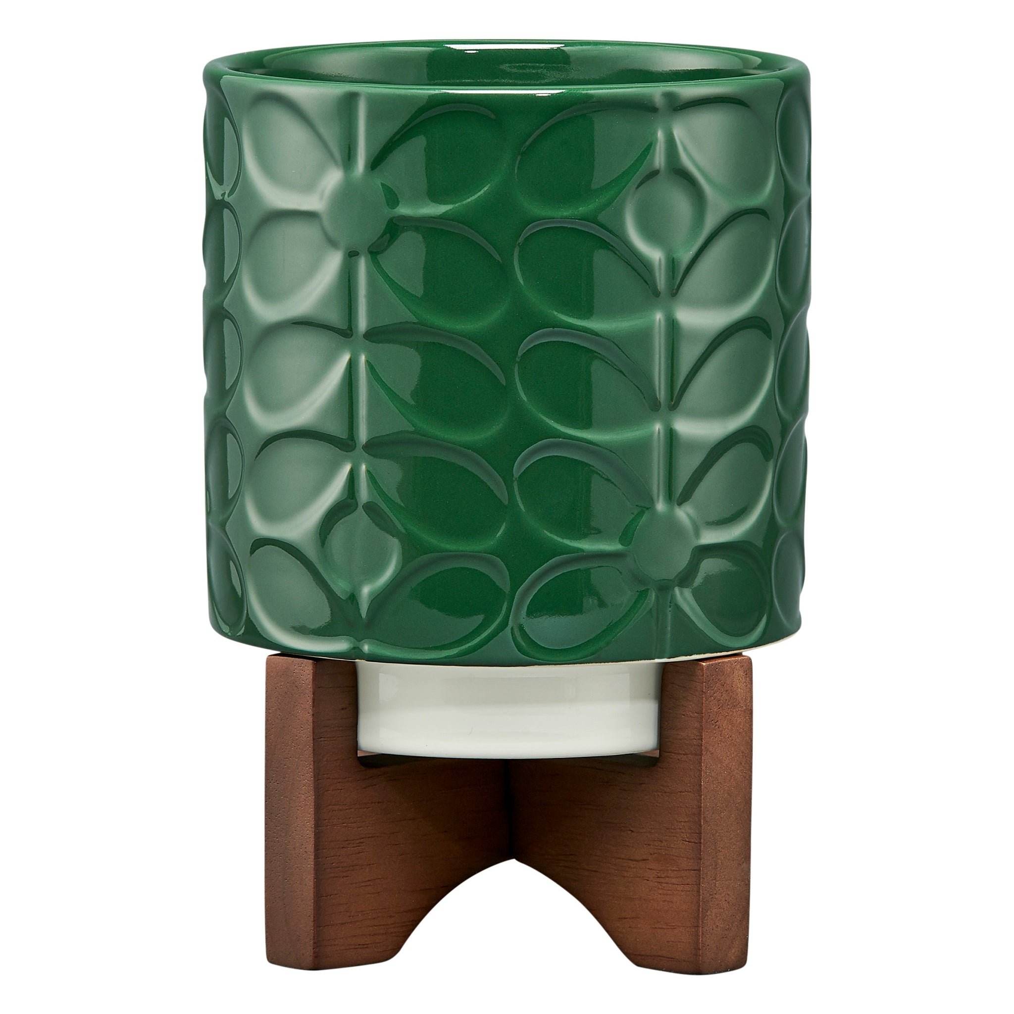 Orla Kiely Ceramic Plant Pot with Wooden Stand (Small) - 60s Stem Jade