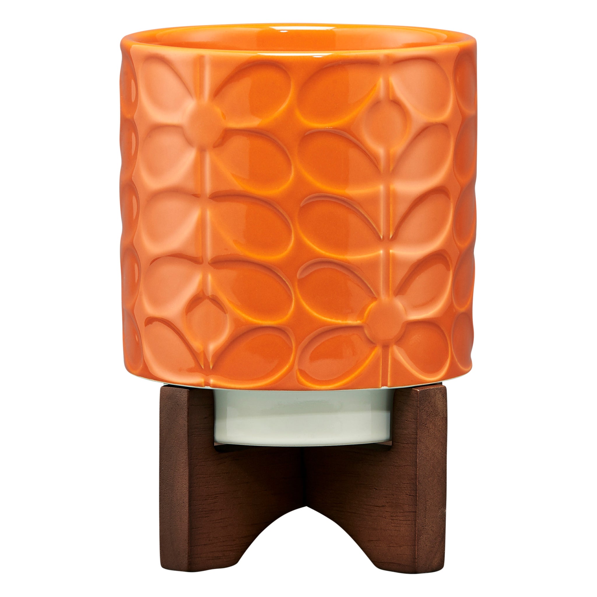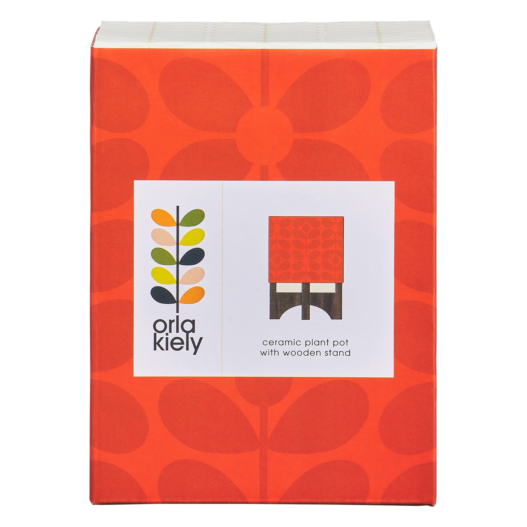 Add a touch of greenery to your home with this Ceramic Plant Pot from Orla Kiely. Round ceramic plant pot on wooden stand. Features debossed 60s Stem pattern in tomato colourway.